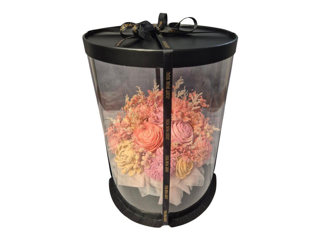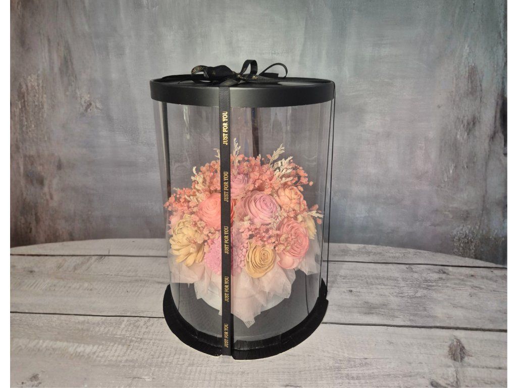 Ručně vyráběné květiny, k nerozeznání od živých, přinášejí do vašeho domova trvalou krásu a styl. Květiny jsou pečlivě uspořádány v průhledném dárkovém boxu, ovázaném elegantní stužkou, takže je hned připravený jako originální dárek nebo stylový doplněk interiéru.