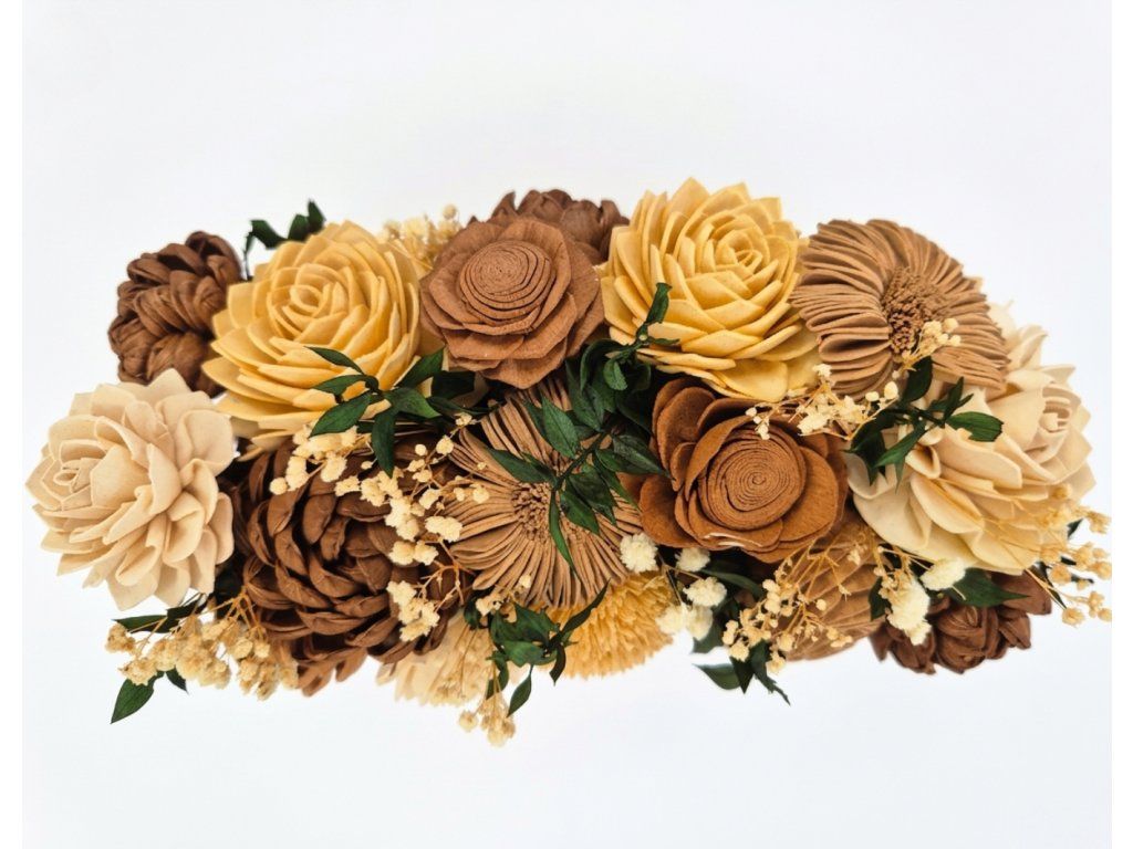 Každý květ je ručně vyřezávaný a pečlivě aranžovaný, aby působil jako skutečný. Kombinace jemných odstínů, kvalitního materiálu a precizního zpracování vytváří dojem živé kytice, která nevyžaduje žádnou péči.